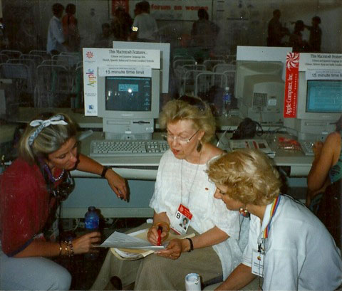 Apple Computer, Inc.sent 80 Apple Volunteers and 100 MACs to a large warehouse in Huairou, China for the first 'cyber center,' and women from 190 countries experienced email and the Global Cyber Women's Movement was launched. See WIN's HERSTORY page for WIN's involvement in connecting Apple Inc with women worldwide on E-world.