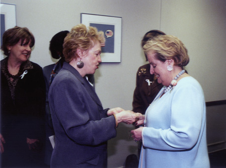 Marilyn Fowler, WIN, presenting a "Breaking the Glass Ceiling" brooch to Secretary of State Madeline Albright, March 2000, at the Beijing +5 Ceremony, US State Department.