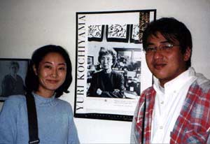 Asuka Hayashi and Minoru Ohashi framing a picture of their heroine, Yuri Kochiyama, Honorary Chair of WIN, displayed at the San Francisco Women's Building.